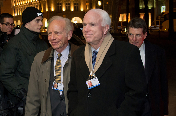 Former U.S. Sen. Joseph Lieberman of Connecticut with U.S. Sen. John McCain at the Munich Security Conference in Munich, Germany, Jan. 31, 2014. Photo credit: Joerg Koch/Getty Images